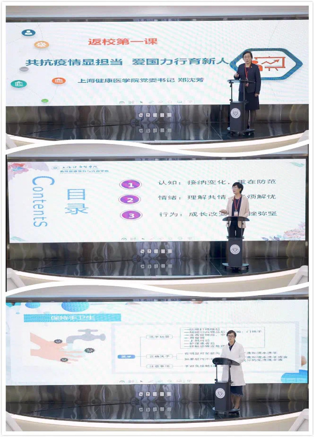 5月14日下午1点半,校党委书记郑沈芳、心理健康教育与咨询中心教师祖燕飞和卫生保健部部长陈建萍为返校学生和毕业班辅导员带来了“返校第一课”。首先,校党委书记郑沈芳以共抗疫情显担当,爱国力行育新人为主题,围绕好样的青年人、最美的青年人和健康的青年人三个方面,回顾了我校在疫情期间所做的工作,讲述了我校校友驰援武汉的事迹,并感谢同学们在疫情期间配合学校共同战胜疫情所做的努力。随后,心理健康教育与咨询中心教师祖燕飞以平稳心态,健康发展为主题,从返校后学生的认知调整、情绪管理和行为策略三个方面带来了一堂疫情心理课。最后,卫生保健部部长陈建萍以守护健康,远离“新冠”为主题,讲述了在后疫情防控时代,返校学生在校园内“医”食住行以及个人的健康防护,带来了一堂疫情保健课。