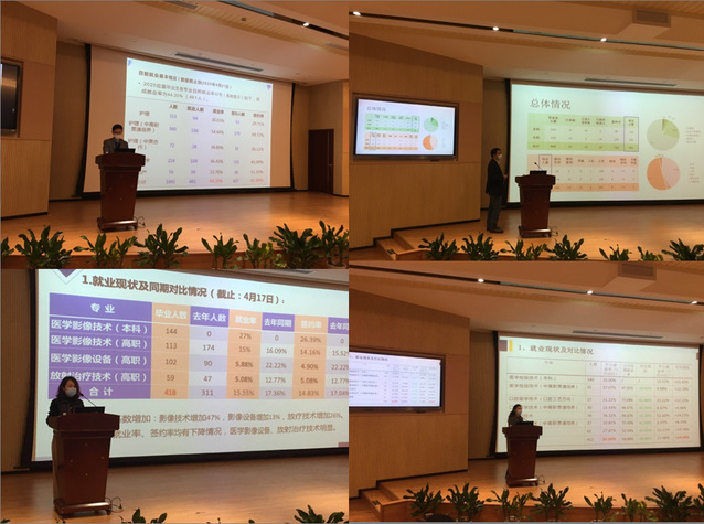 各二级学院书记、院长分别汇报了学院毕业生的具体进展,统计已就业、本地与外地待就业、升学、考公务员、自主创业等具体数据;排摸学生就业意向,对就业懈怠、就业困难、就业方向单一的学生进行梳理;对每类、每位同学情况做到精准分析与指导。同时,对受疫情影响的企业试工、升学面试、护考等因素也做了详细分析,汇报了学院的应对措施。