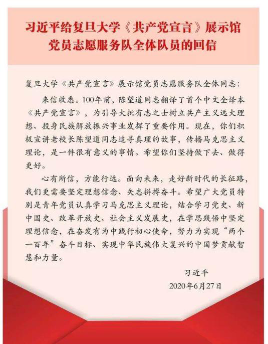 6月30日,习近平总书记给复旦大学《共产党宣言》展示馆党员志愿服务队全体队员回信,勉励他们将有意义的事坚持做下去,用宣讲陈望道同志追求真理的故事继续传播马克思主义理论,并对全国广大党员特别是青年党员提出殷切期望。学校各级团组织近期组织全校团员青年积极开展习总书记给复旦大学师生党员回信专题学习,党员、优秀团员带头,引领全校青年认真学习马克思主义理论,踏实开展“四史”学习,在学思践悟中坚定理想信念,在奋发有为中践行初心使命。我校青年师生在观看当晚新闻联播后引起热议,纷纷表达对习总书记寄语的所思所想所悟。