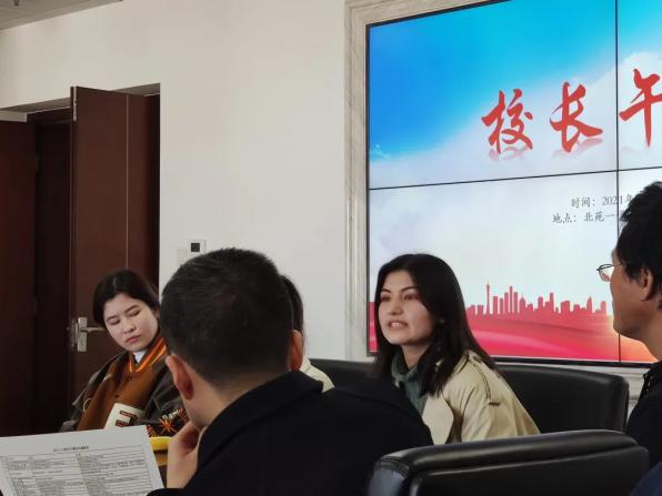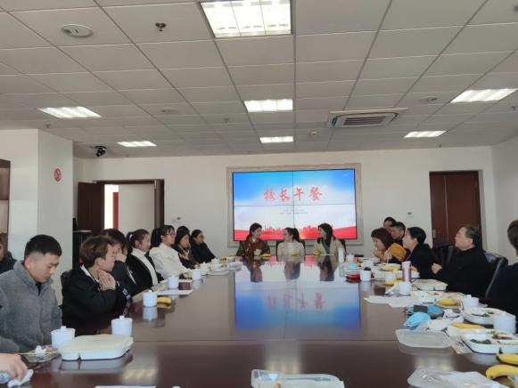 在2021年2月4日中午11:40分北苑1号楼802会议室,我校召开了寒假期间的校长午餐,校领导与学生代表一起用餐,边吃边聊,耐心地倾听学生代表们的意见,同学们少了往日的拘谨,对身边的各种问题各抒己见,畅所欲言,校领导也对他们的问题进行一一解答。