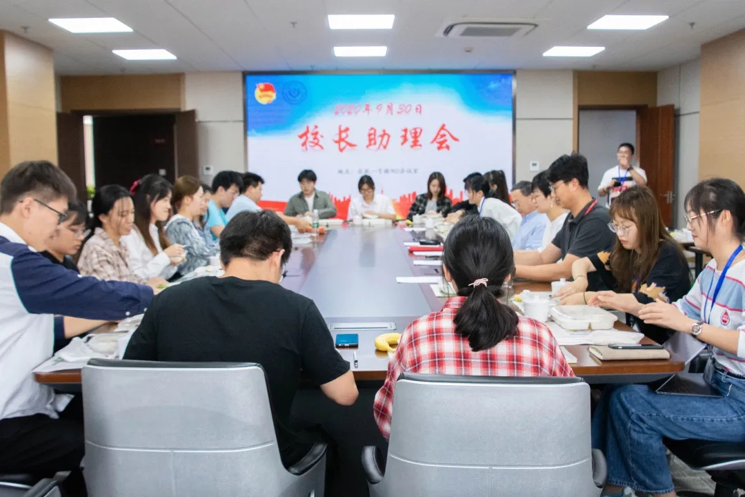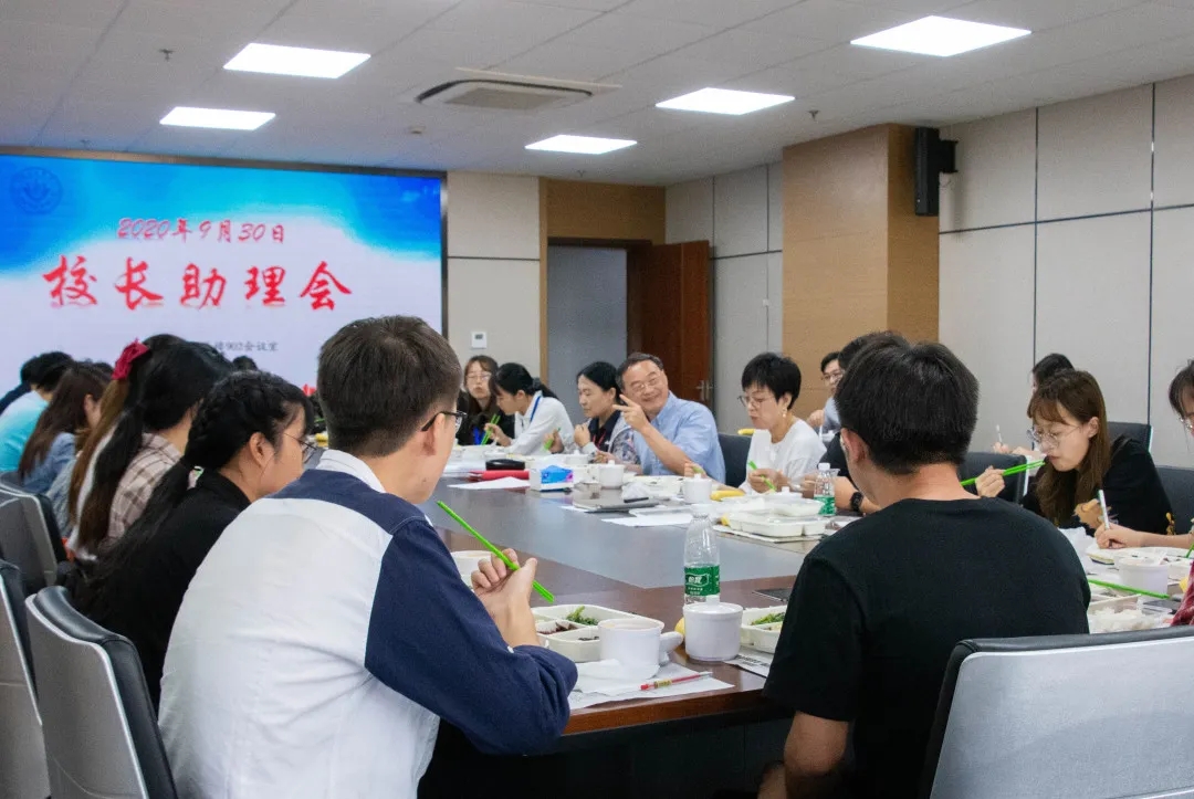 2020年9月30日,校长助理午餐活动在北苑1号楼902会议室举行,参加此次活动的有校长黄钢、党校办、学生处、校团委负责老师以及全体学生校长助理们。会议上校长助理们提出的问题得到了校方领导的一一解答。