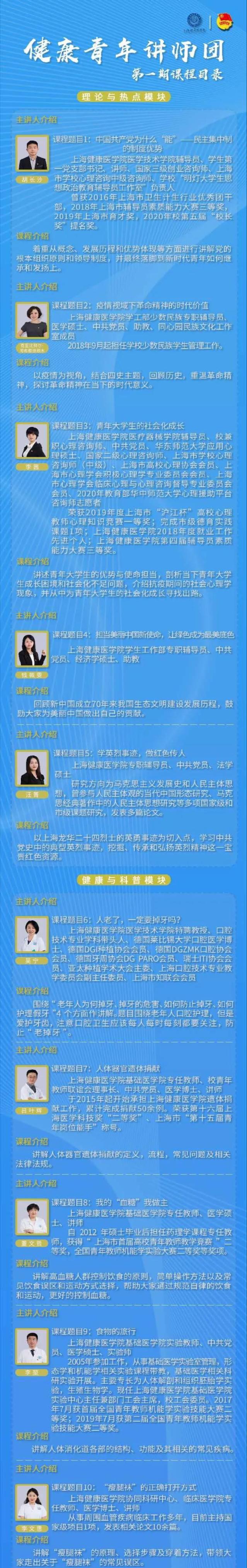 健康(青年)讲师团课程的主要内容分为思政与热点、健康与科普两大板块。其中: 思政 与热点板块分4讲,以中国共产党为什么“能” 设问、 以学习龙华二十四英烈事迹和历史抗战精神为切入点、以“健康中国2030”规划纲要和五大发展理念之绿色发展为侧重点,促使青年自觉担当历史新使命。健康与科普板块分14讲,达到宣传健康科普知识和健康生活理念,服务全民健康的目的。