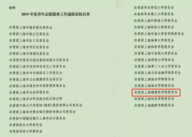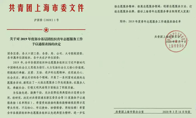 近日,共青团上海市委下发《关于对2019年度部分基层团组织青年志愿服务工作予以通报表扬的决定》(沪团委〔2020〕1号),我校团委获通报表扬。