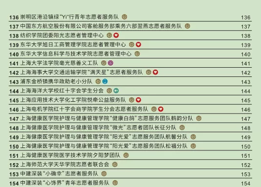 我校青年志愿者的工作是在校团委指导下为社会大众服务,服务内容涉及社区医疗类、爱心奉献类、科普文化类、行业服务类以及赛事机动类等多个领域。在2019年,校团委积极联合多部门,开展多方全员育人,新签订图书馆、文理教学部、保卫处三个志愿者培育基地,共建立17个校内志愿者培育基地,开展10个志愿者品牌项目创建工作,新增并签约30个志愿者实践基地,其中新建肿瘤医院、浦东新区人民医院、中西医结合医院、上海市眼病防治中心等医疗类实践基地10个。2019年志愿者注册人数7080人,全校121支志愿者团队,服务人65185人次,全年总服务时数175586小时。连续7年全程助力上海科技节志愿服务;参与2019tHIS健康产业领袖峰会、世界武术锦标赛等大型志愿服务活动并获得主办方和服务对象的高度评价;连续四年科技馆服务人次第一名,荣获2019年度上海科技馆志愿者活动优秀集体(连续4年),获得了上海市精神文明办、教卫工作党委和团市委的表彰。